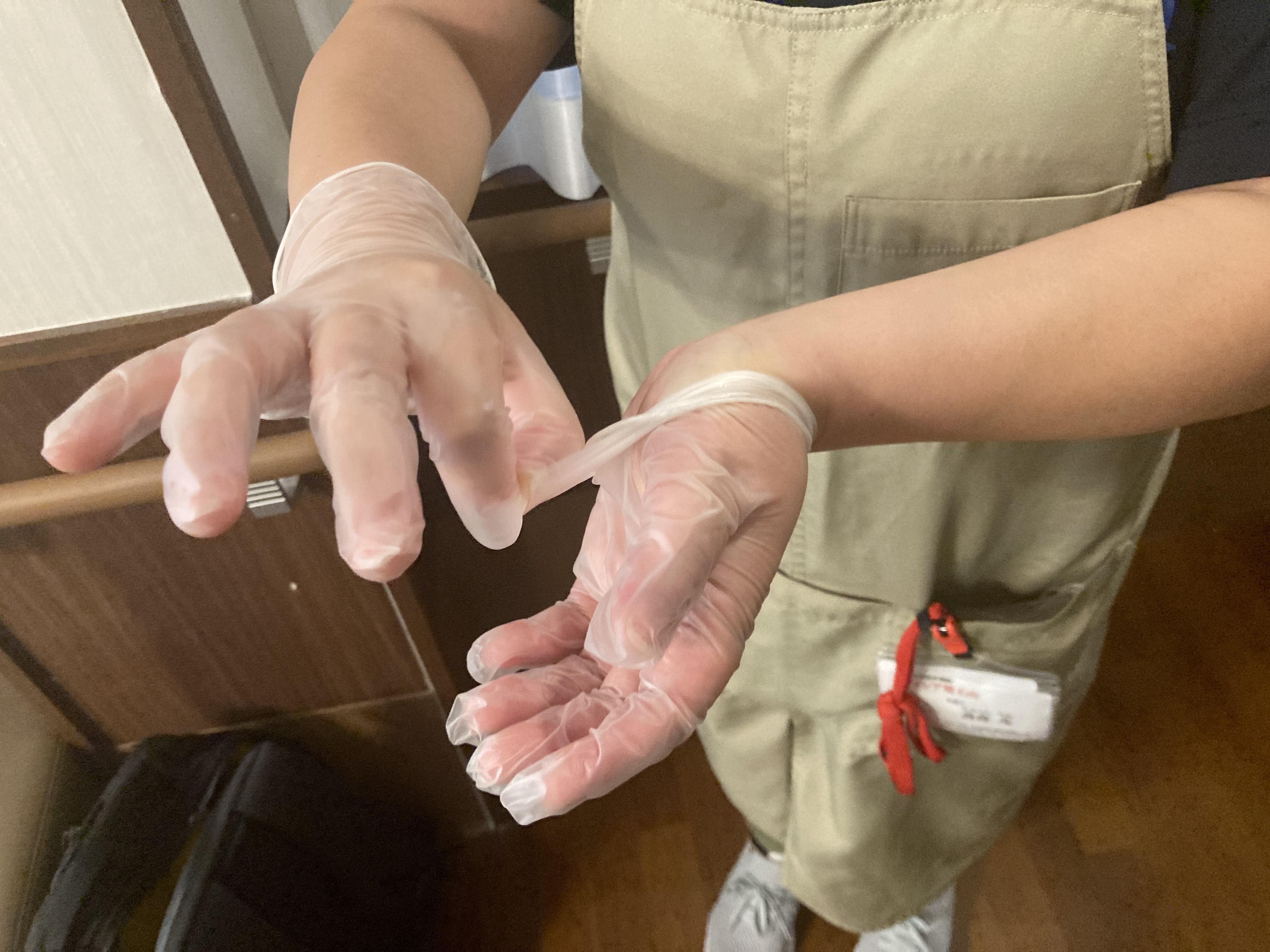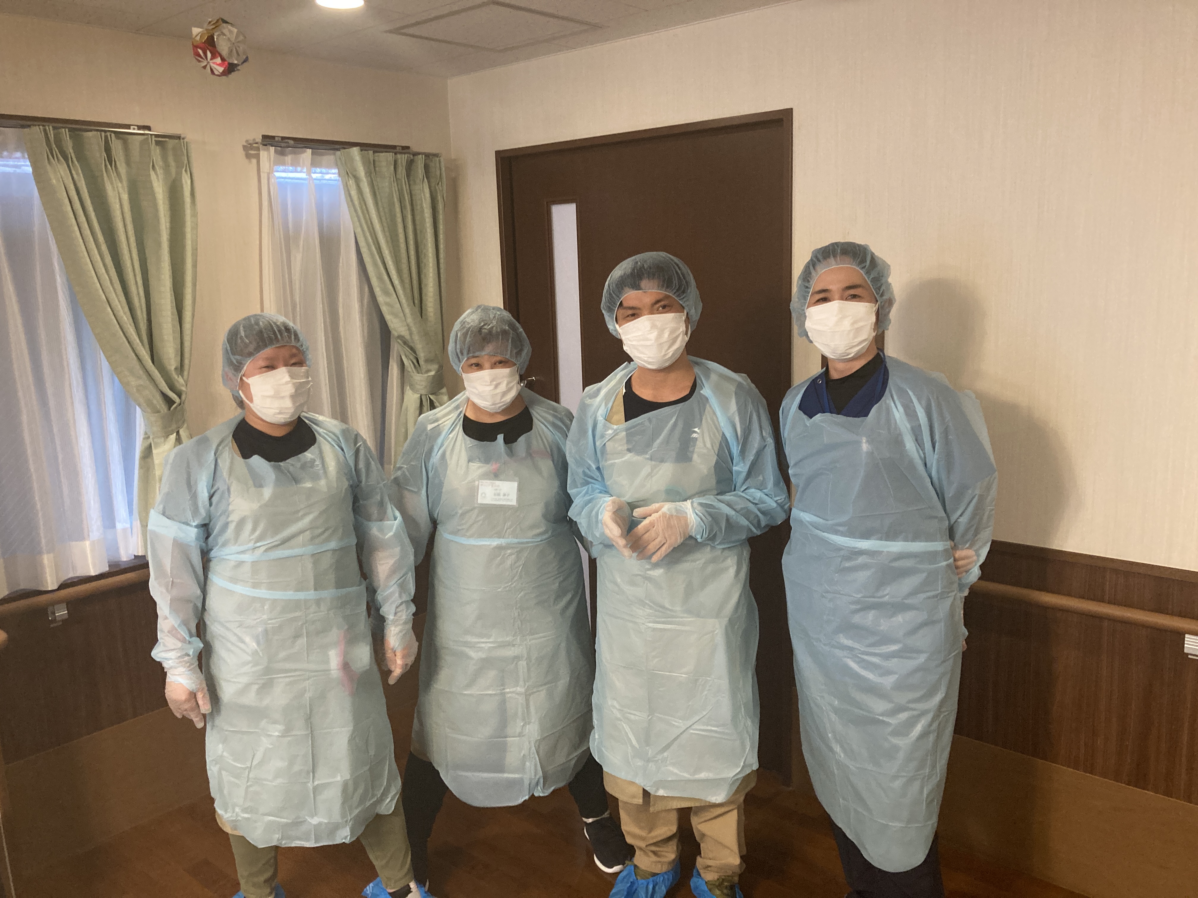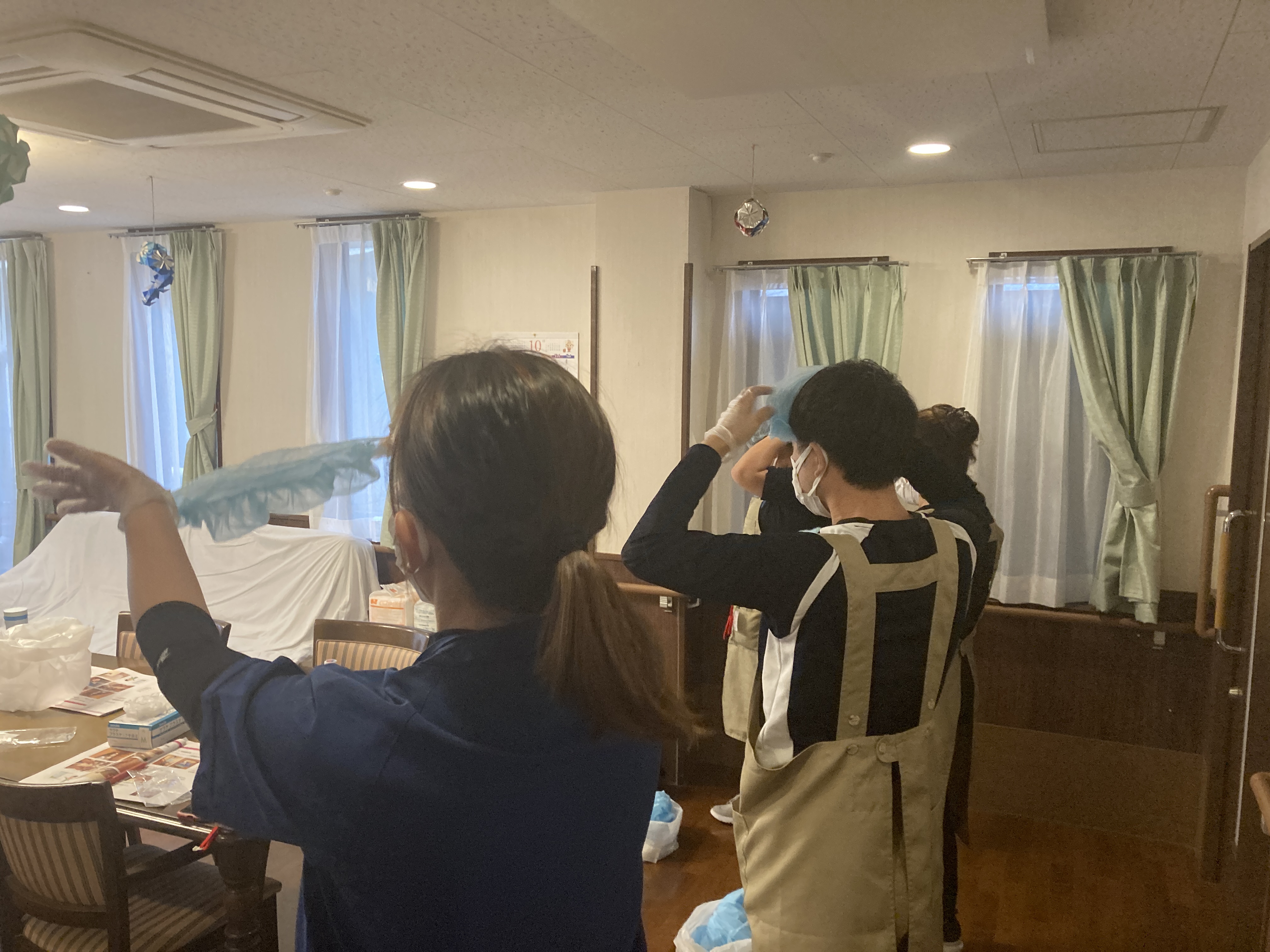 後半パートではグリーンゾーン(清潔)・レッドゾーン(汚染)へ入退室する際の防護服の正しい着脱方法を実施しました☆