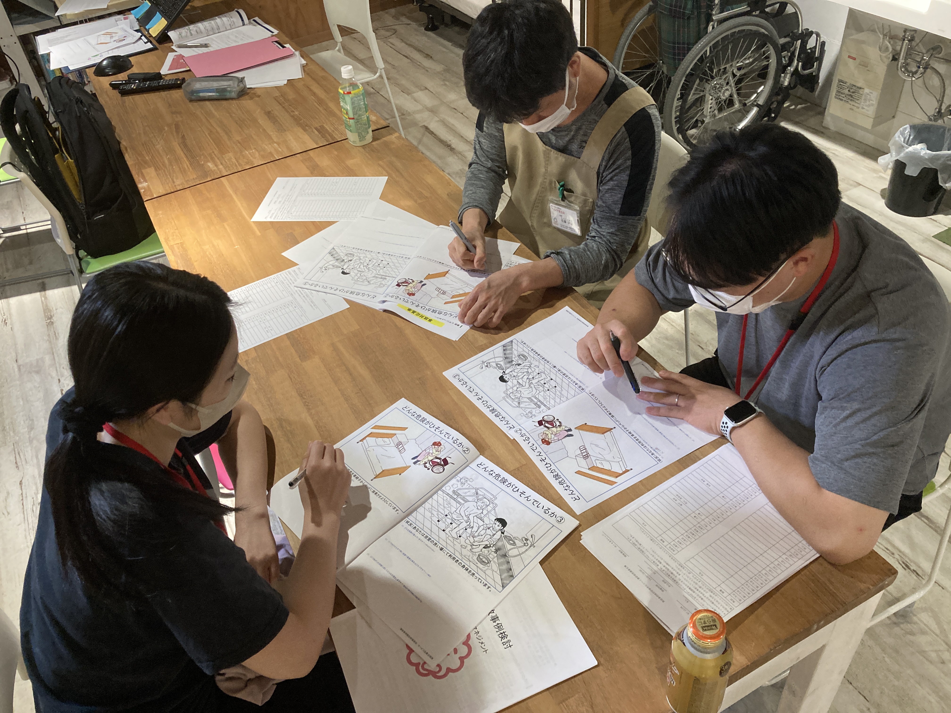 介護現場で起こりえる事故事例をもとに背景や要員を分析し、再発防止に向けた対策を検討しました。