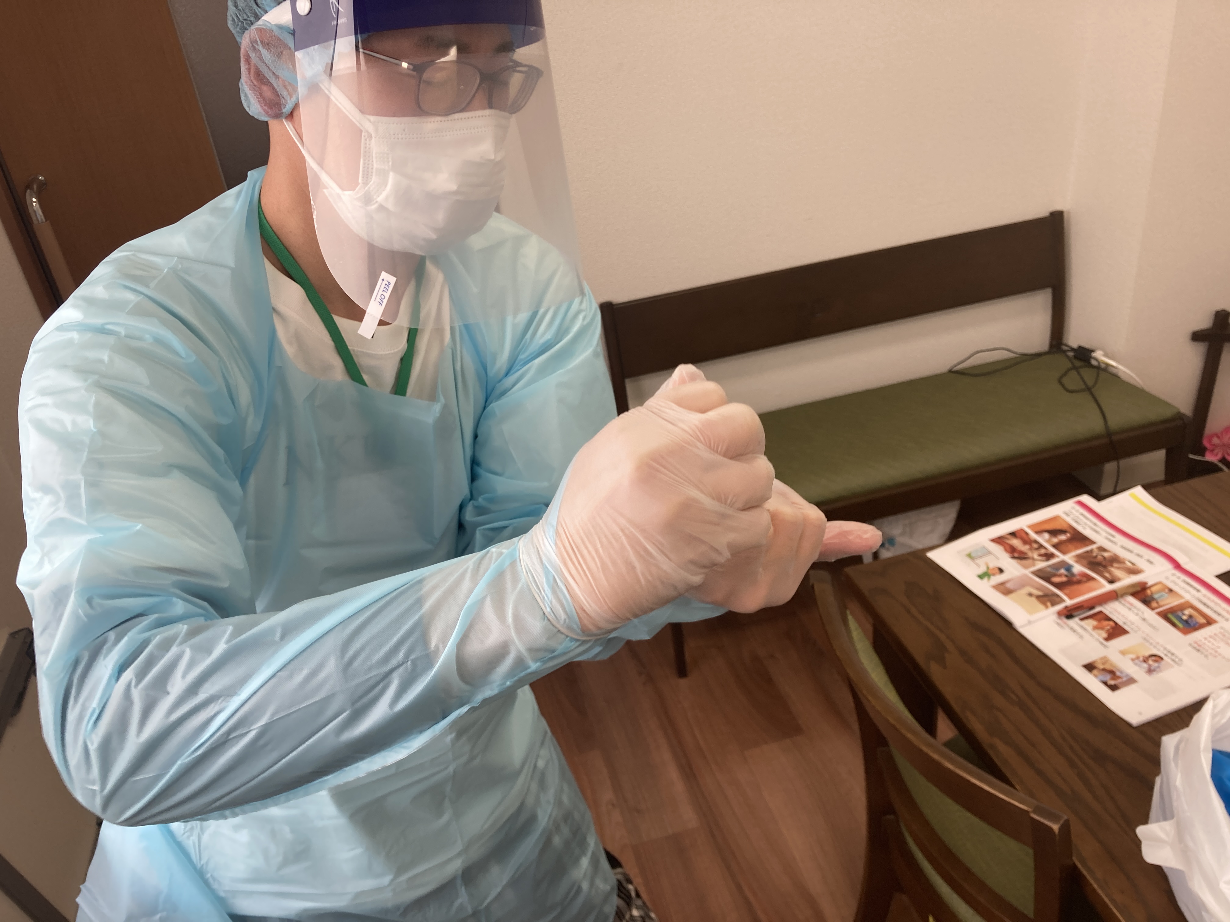 後半パートではグリーンゾーン(清潔)・レッドゾーン(汚染)へ入退室する際の防護服の着脱を体験しました☆